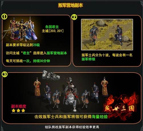 当玩家们的等级达到25级,就可以从本国君主处进入叛军营地副本,作为玩家第一次过关的副本,叛军营地可是有海量的经验哦!